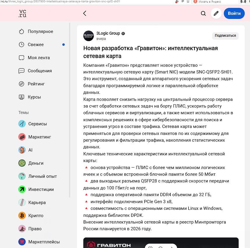 Судя по всему, одна из целей компании – участие в гостендерах. На это указывает информация из публикации компании 3Logic Group на сайте VC.ru, согласно которой «Гравитон» намеревается внести карту SNC-QSFP2-SH01 в реестр Минпромторга в течение 2026 г.