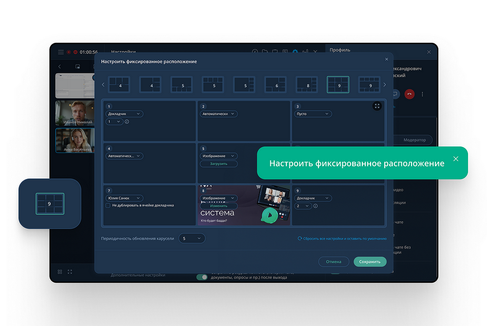 Основные пользовательские нововведения сосредоточены в обновленных клиентских приложениях IVA Connect Web 22.0 и IVA Connect iOS 22.0. Веб-клиент получил расширенные инструменты для управления видеоконференциями. Ключевым улучшением стала возможность тонкой настройки фиксированных видеораскладок. Организаторы и модераторы теперь могут назначать для участников различные режимы отображения: классическую мозаику, селектор с активными спикерами, режим постоянного присутствия для ключевых докладчиков или фиксированное расположение окон для формализованных переговоров. Это позволяет структурировать визуальную часть крупных совещаний, вебинаров или партнерских сессий, повышая вовлеченность и удобство восприятия.