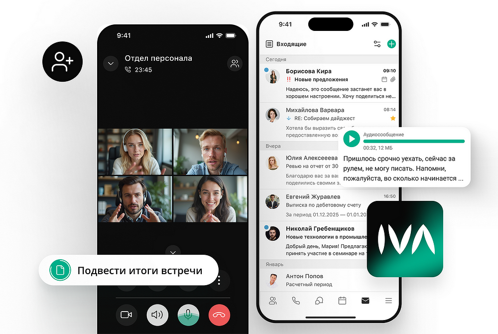 IVA One разработана таким образом, чтобы стать единственным коммуникационным приложением для сотрудников. Платформа объединяет в одном интерфейсе видеоконференцсвязь, корпоративный мессенджер, аудио- и видеозвонки, электронную почту, календарь, адресную книгу, а также инструменты автоматизации на базе искусственного интеллекта.